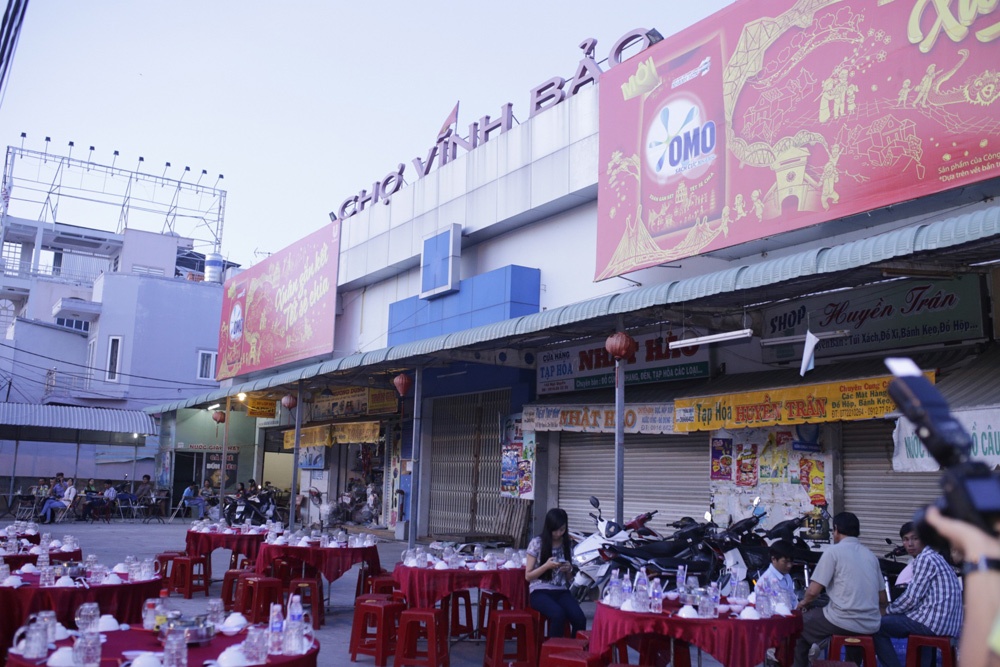 | Tối 26/12, gia đìnhThủy Tiên đãi tiệc khách mời ngay trước cổng chợ Vĩnh Bảo vì quá đông. |