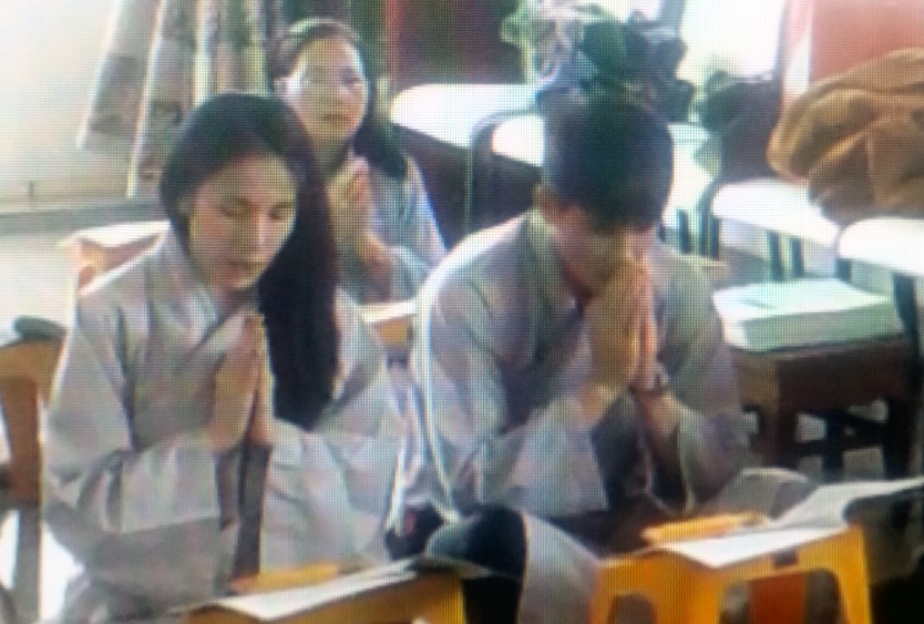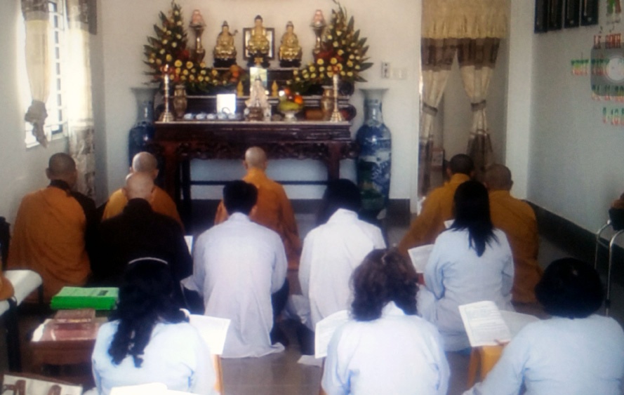 | Thủy Tiên - Công Vinh mời 5 sư thầy đến cầu nguyện. Cặp đôi hy vọng cuộc sống vợ chồng luôn suôn sẻ, hạnh phúc. Mẹ nữ ca sĩ và mọi người trong gia đình đều mặc áo xám chăm chú cầu nguyện cho cặp đôi trước bàn thờ. |