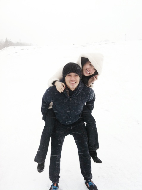 Công Vinh nhiệt tình cõng vợ đi dạo trong gió tuyết.