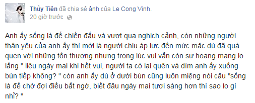 Đây không phải là lần đầu tiên Thủy Tiên đồng cảm và chia sẻ với ông xã về những thăng trầm của Công Vinh trong suốt sự nghiệp quần đùi áo số. Mới đây, khi CV9 ghi siêu phẩm vào dưới của Indonesia, giọng ca Chàng trai tháng 12 cũng chia sẻ sự lo lắng: "Liệu ngày mai khi hết vui, người ta có lại quên và dìm anh ấy xuống bùn tiếp không".