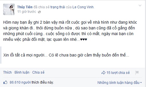 Không trực tiếp tới SVĐ Mỹ Đình để theo dõi trận đấu, Thủy Tiên chỉ có thể quan sát, ủng hộ chồng và các đồng đội qua màn ảnh nhỏ cùng hình ảnh từ báo chí. Khi nhìn thấy chùm ảnh khóc nức nở vì nuối tiếc của Công Vinh, Thủy Tiên tiếp tục chia sẻ: "Xem xong mình cũng khóc theo... Xót quá".