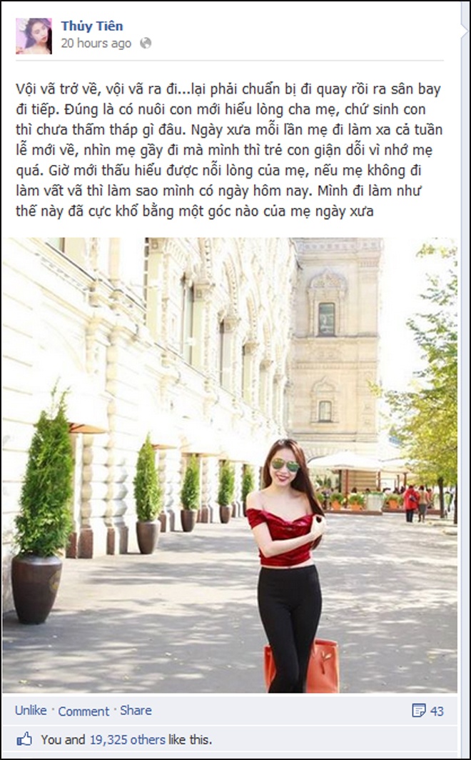 Trên trang cá nhân, Thủy Tiên bất ngờ chia sẻ nỗi niềm của một người mẹ trẻ phải xa con. Đây là lần đầu tiên, mẹ bé Bánh Gạo tâm sự chuyện làm con rồi làm mẹ trên trang cá nhân. Khá chăm chỉ cập nhật trang mạng xã hội riêng nhưng hầu như nữ ca sĩ chỉ chia sẻ hình ảnh và thông tin về các dự án âm nhạc, quảng cáo chứ rất hiếm khi nhắc tới chuyện riêng tư.