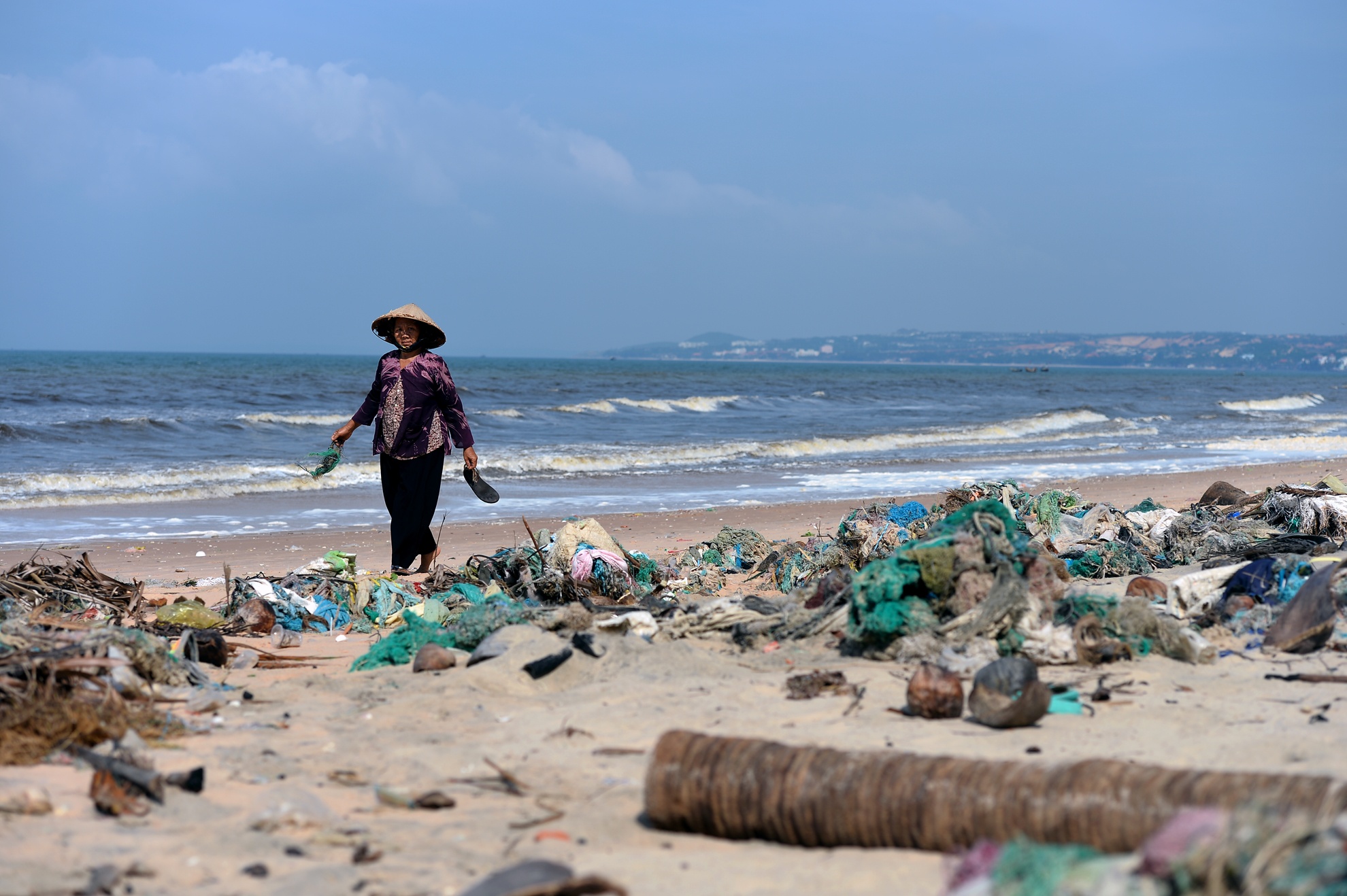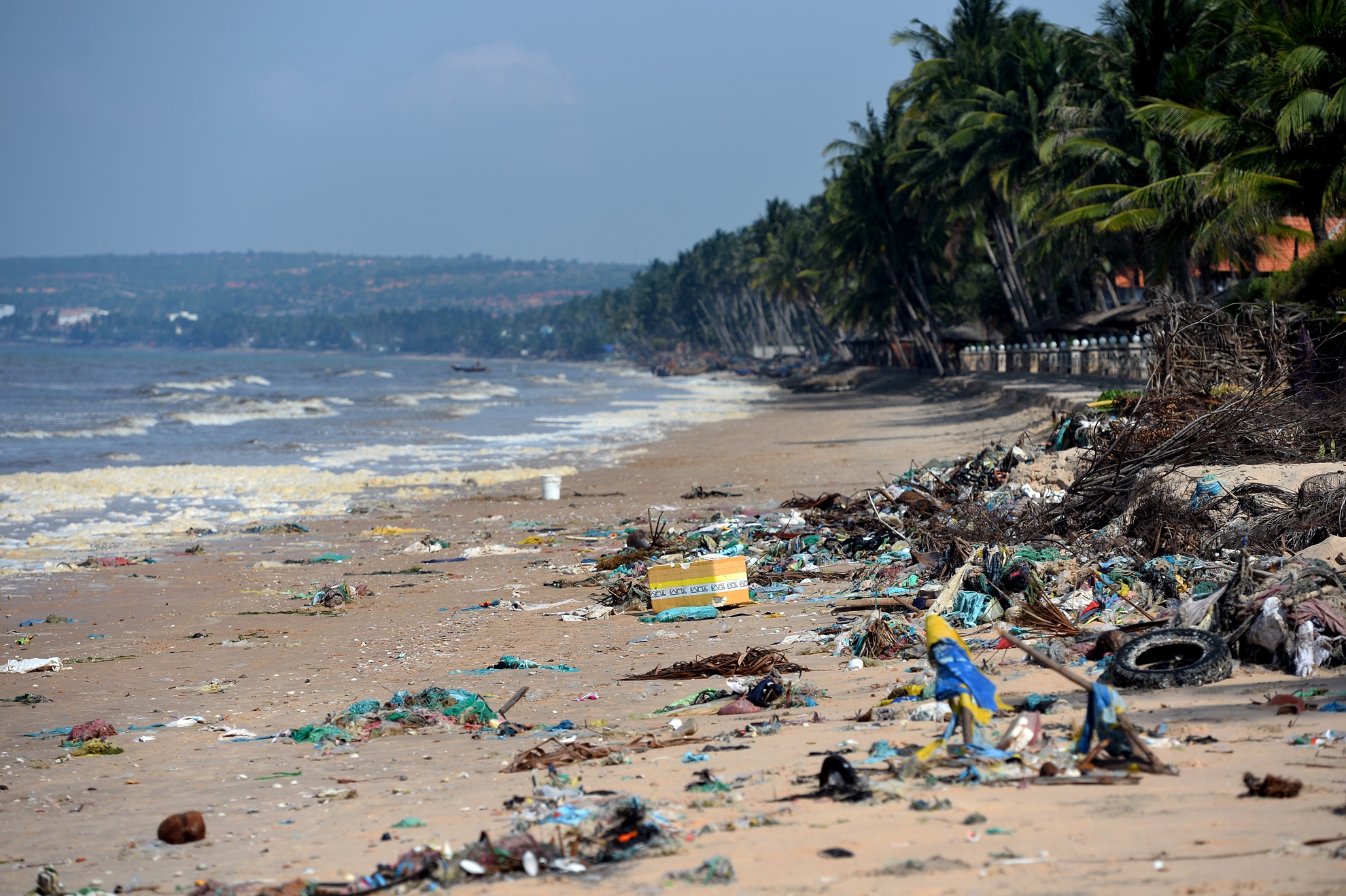| Rác tràn ngập không người dọn dù xung quanh là các resort cao cấp. |