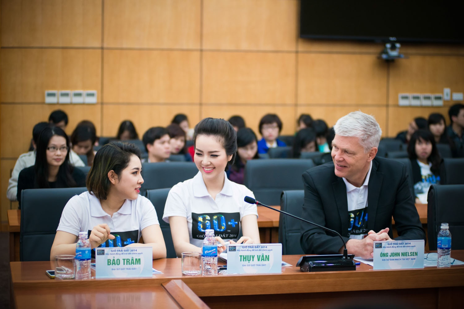 | Thụy Vân và Bảo Trâm vui vẻ trò chuyện về chiến dịch cùng Đại sứ Đan Mạch tại Việt Nam - ông John Nielsen. Ông Nielsen cũng là một trong những gương mặt đại sứ cho chiến dịch Giờ Trái đất năm nay. |