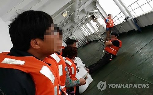 | Các hành khách cố giữ thăng bằng khi tàu nghiêng và bắt đầu chìm. Ảnh: Yonhap. |