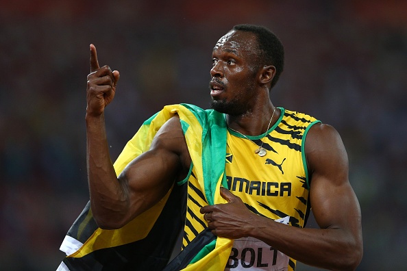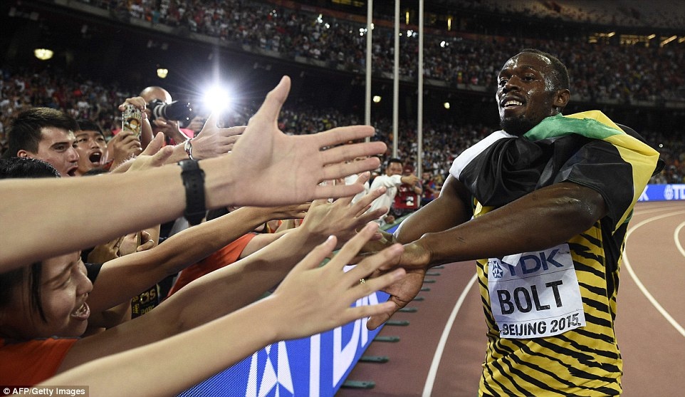| Usain Bolt khoác trên mình lá quốc kỳ Jamaica chạy tới ăn mừng cùng người hâm mộ trên SVĐ có hình tổ chim ở Bắc Kinh (Trung Quốc). |