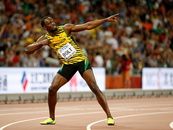| Usain Bolt ăn mừng chức vô địch trên đường chạy 100 m tại giải Điền kinh thế giới 2015. |