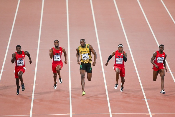 | Ngay khi rời vạch xuất phát, Usain Bolt bị đeo bám bởi 4 vận động viên áo đỏ đều là người Mỹ cùng quốc tịch với đối thủ Gatlin. |