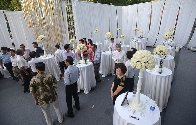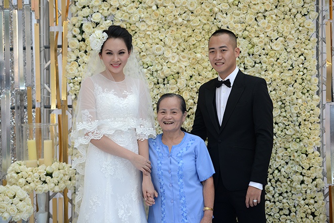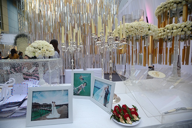 Cô dâu - chú rể thuê hẳn một công ty tổ chức tiệc cưới từ Sài Gòn ra Hà Nội chuẩn bị cho hôn sự của mình. Họ cũng khéo léo kết hợp văn hóa truyền thống với hiện đại khi đặt những miếng trầu cau được têm cầu kỳ bên các chân nến và những tấm hình cưới chụp ở Maldives cách đây ít tháng.