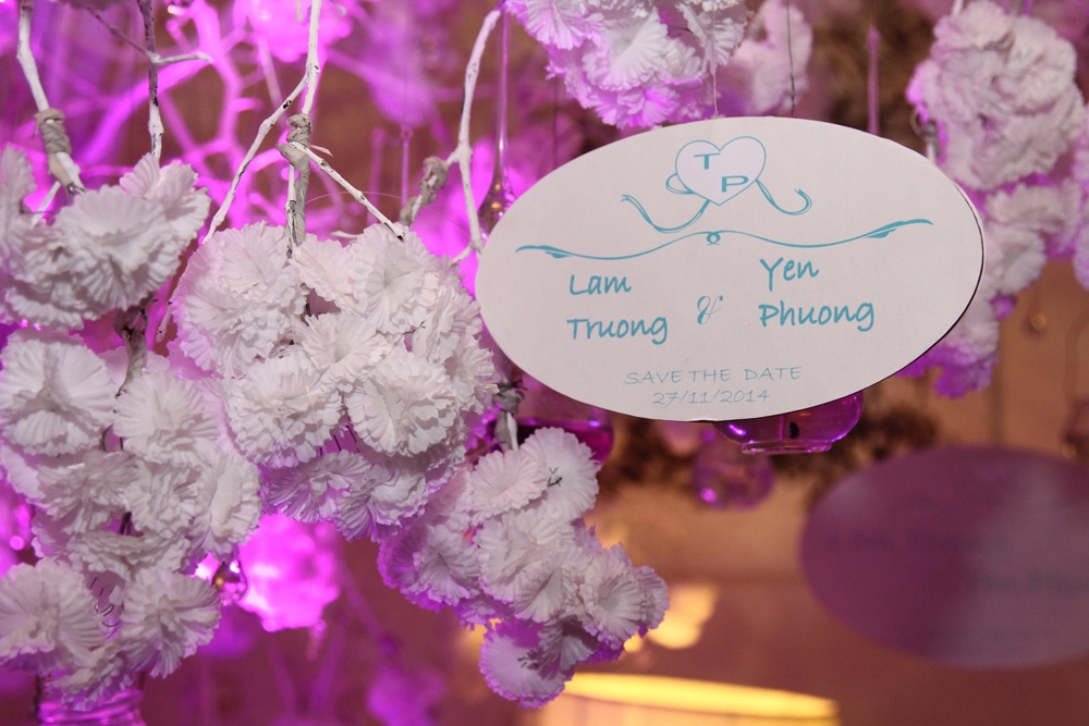 | Trên cành hoa giấy còn trưng tên Lam Trường, Yến Phương do chính cặp đôi viết tay lãng mạn. |