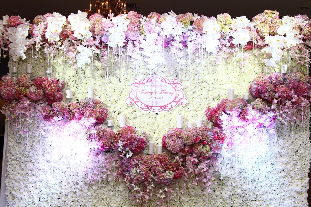 | Không gian tiệc cưới tràn ngập hoa với hai màu sắc chủ đạo là trắng và hồng. Buổi tiệc do chính anh trai Lam Trường chuẩn bị để mừng hạnh phúc cho hai em. |