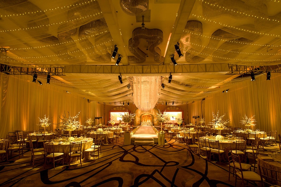 | Khung cảnh nơi tổ chức lễ cưới đầy lãng mạn khi được trang trí bằng hàng ngàn bông hồng trắng, lộng lẫy với những chiếc đèn chùm pha lê. |