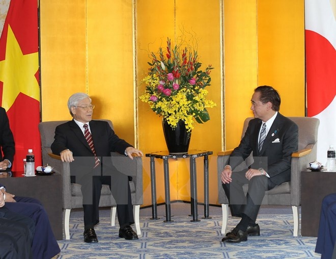 Tổng Bí thư nhấn mạnh với sự tin cậy chính trị, văn hóa tương đồng, lợi ích tương hợp, kinh tế tương hỗ, sự gần gũi và gắn bó giữa nhân dân hai nước và tính bổ sung lớn giữa hai nền kinh tế. Việt Nam và Nhật Bản hoàn toàn có điều kiện để đưa quan hệ hai nước không ngừng phát triển hơn nữa theo phương châm “tăng cường tin cậy, kết nối kinh tế, mở rộng hợp tác, phát triển bền vững, hướng tới tương lai.”