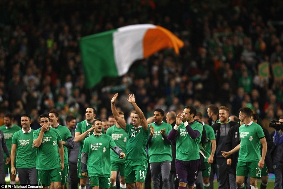 | Giành chiến thắng chung cuộc 3-1 trước ĐT Bosnia sau 2 lượt trận, các cầu thủ Ireland vui mừng khi đoạt vé dự vòng chung kết EURO 2016 diễn ra tại Pháp. |