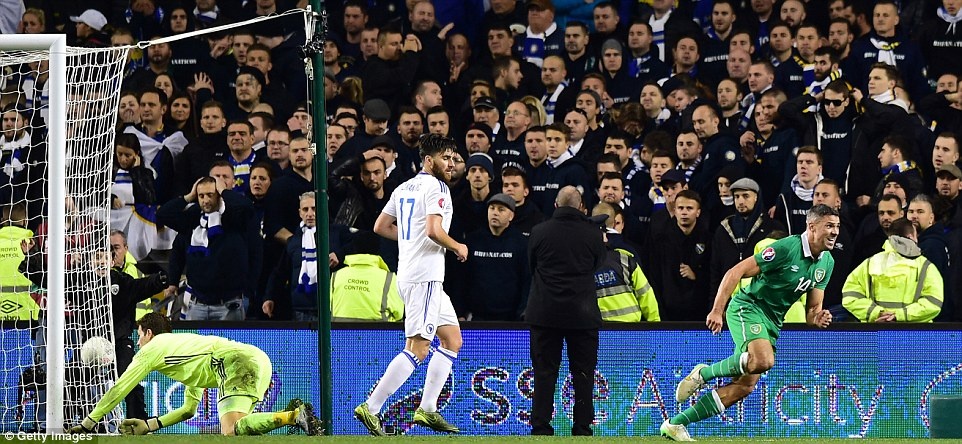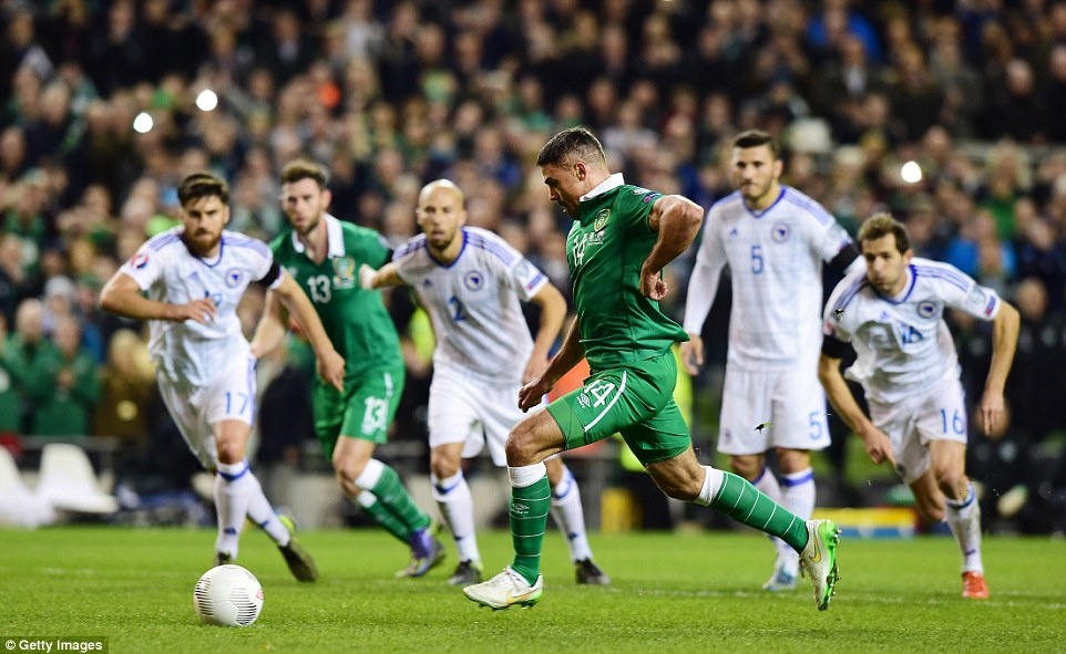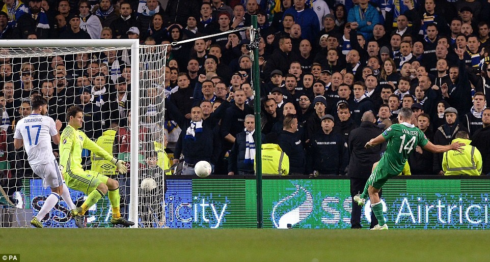 | Sau cú treo bóng từ tình huống đá phạt bên cánh trái, hậu vệ của ĐT Bosnia cản phá đưa bóng đến vị trí của Walters. Trong tư thế không bị kèm, anh hoàn tất cú đúp cho ĐT Ireland. |