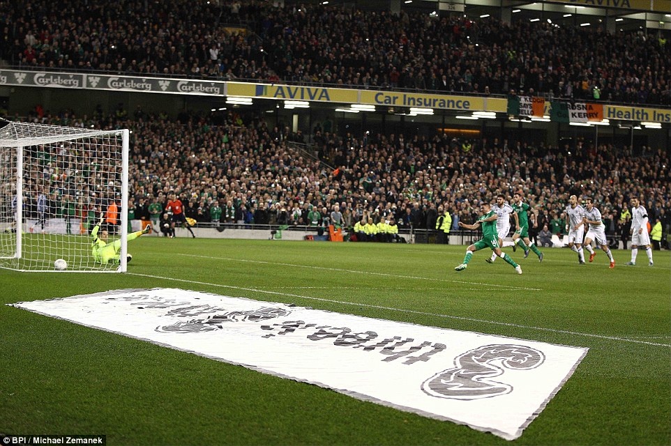| ĐT Ireland nới nộng cách biệt trong trận lượt về lên 2-0 sau cú đệm lòng góc hẹp của Jonathan Walters ở phút 70. |