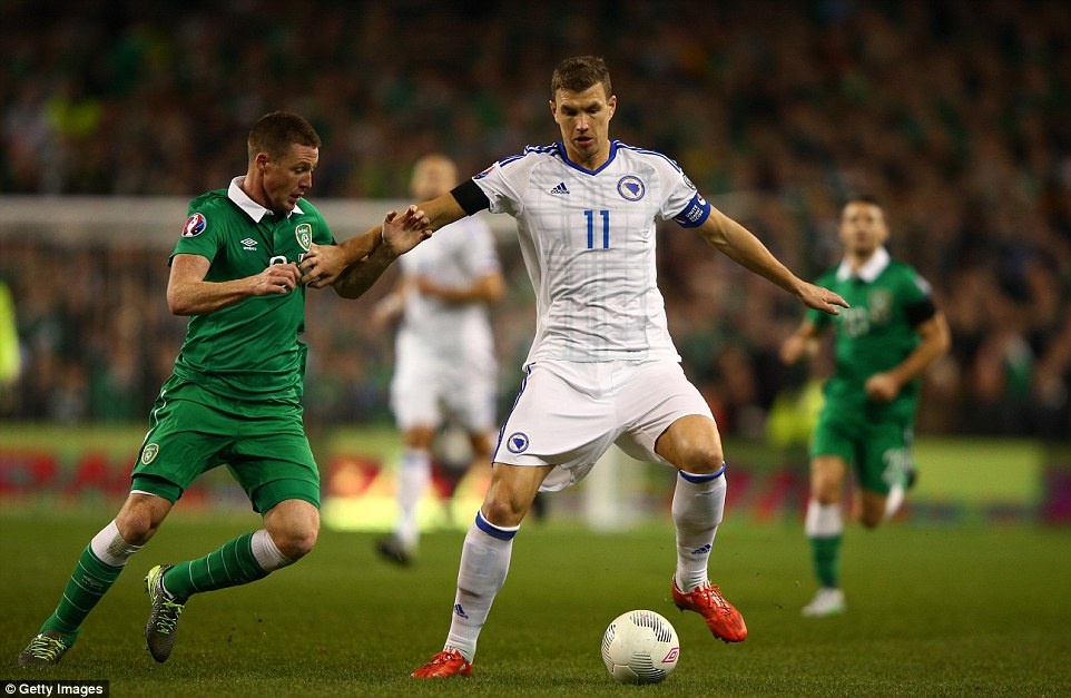 | Chân sút Edin Dzeko (áo trắng) không thể giúp ĐT Bosnia có bàn rút ngắn tỷ số ở trận lượt về. |