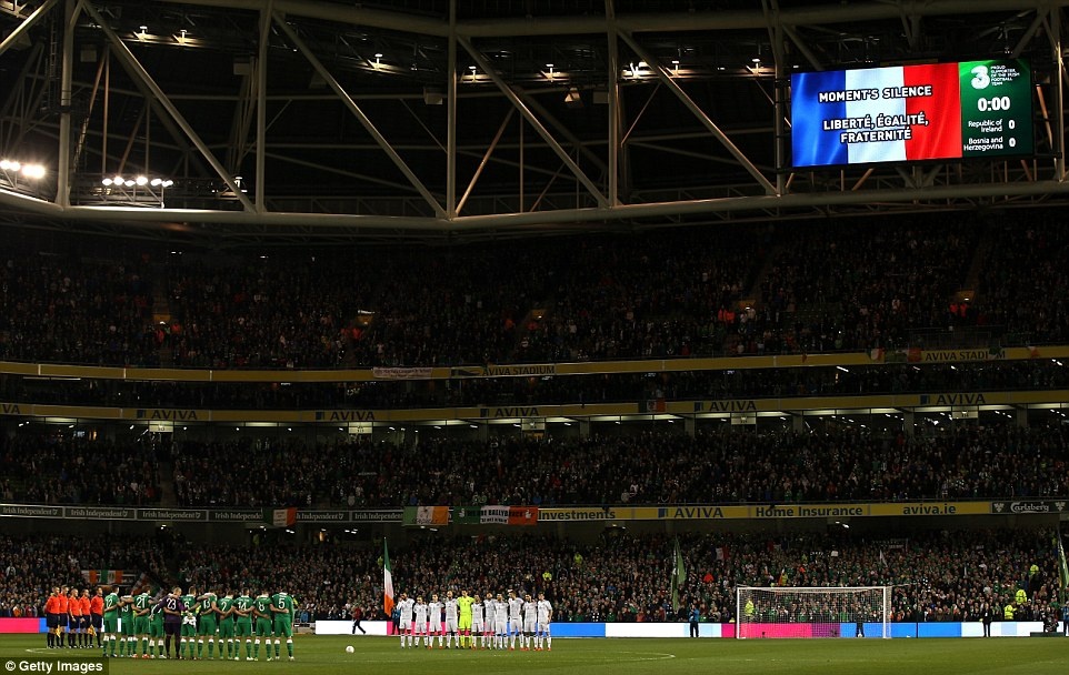 | Ở lượt đi play-off EURO 2016 trên sân của đội tuyển (ĐT) Bosnia, ĐT Ireland có trận hòa 1-1. Trước khi lượt về diễn ra trên sân Aviva, cầu thủ hai đội dành một phút tưởng nhớ đến các nạn nhân thiệt mạng trong vụ trong vụ khủng bố ở Paris (Pháp). |
