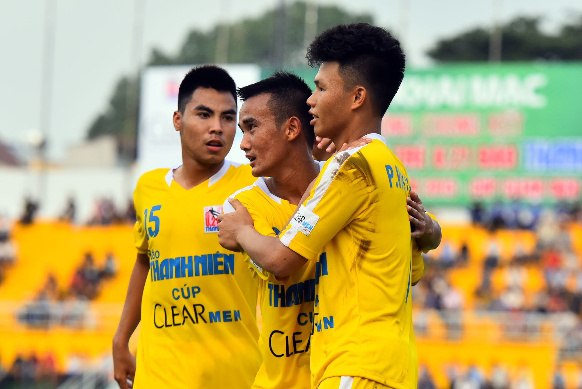 | Văn Thành, Đức Huy cùng đồng đội ăn mừng bàn mở tỷ số của đội bóng thủ đô. |