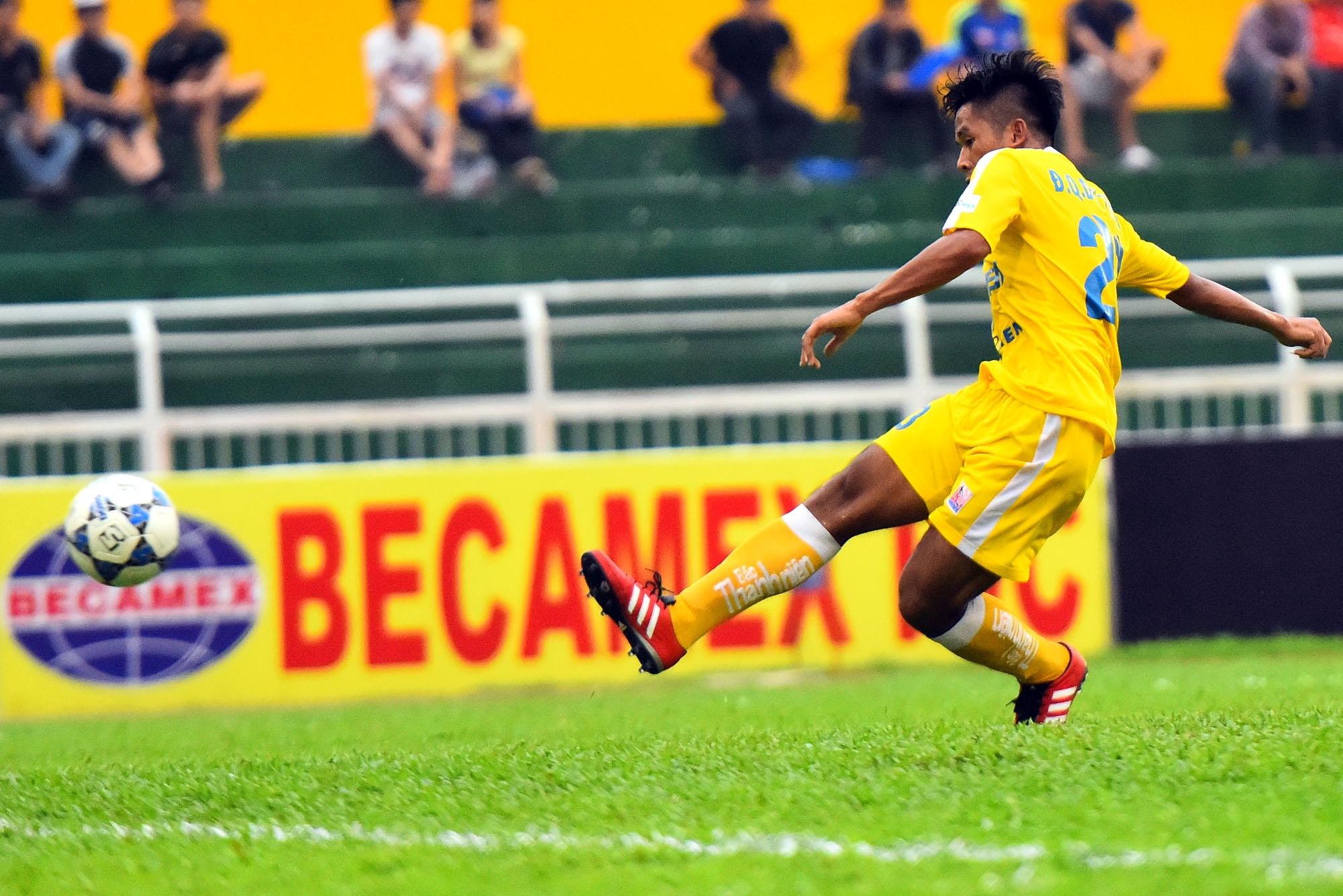 | Ở phút 44 hiệp 1 trận đấu, tiền đạo Văn Thành đi bóng đầy kỹ thuật trong vòng cấm địa khiến các hậu vệ U21 Bình Định phải phạm lỗi. Trên chấm phạt đền, anh dứt điểm gọn gàng mở tỷ số. |