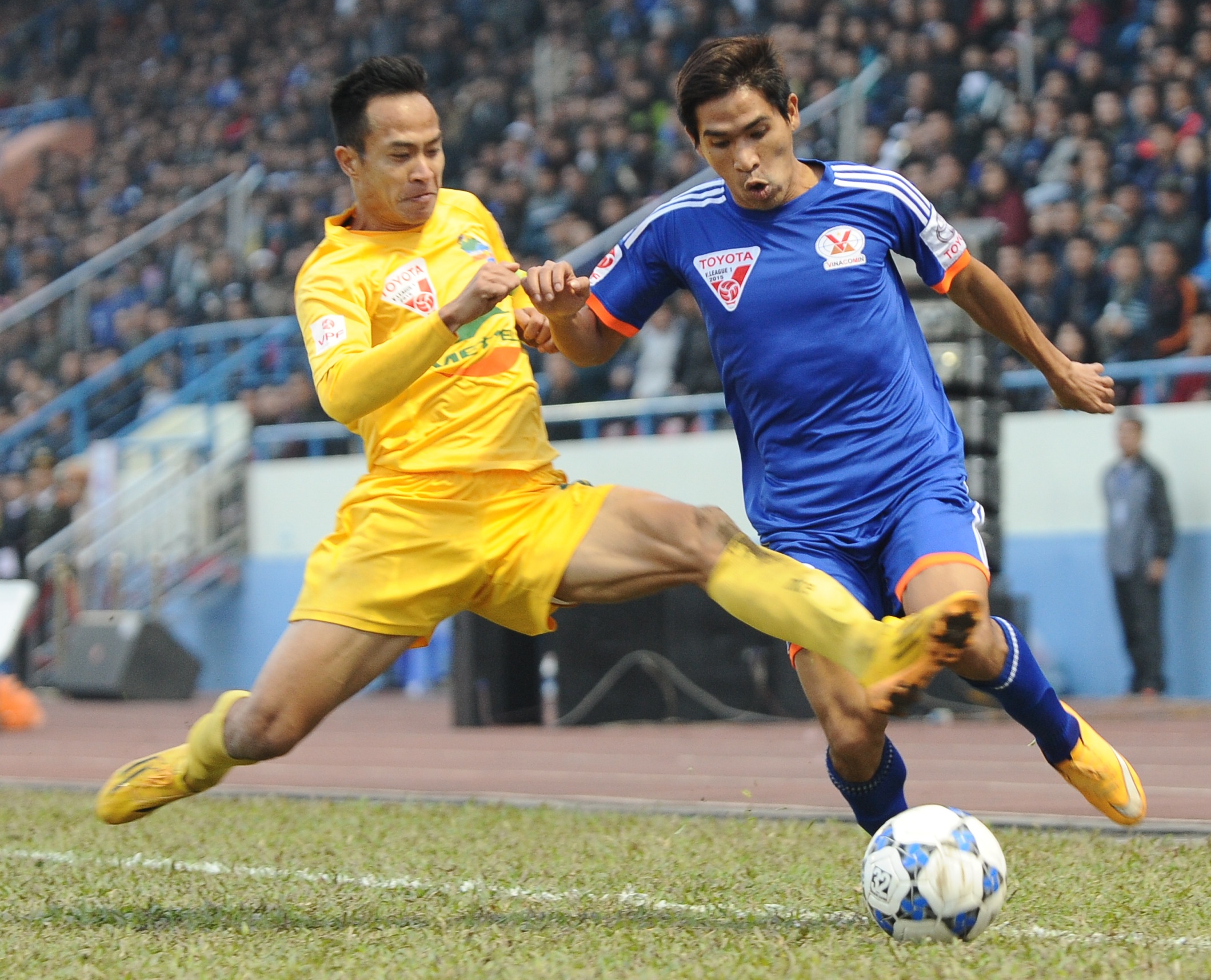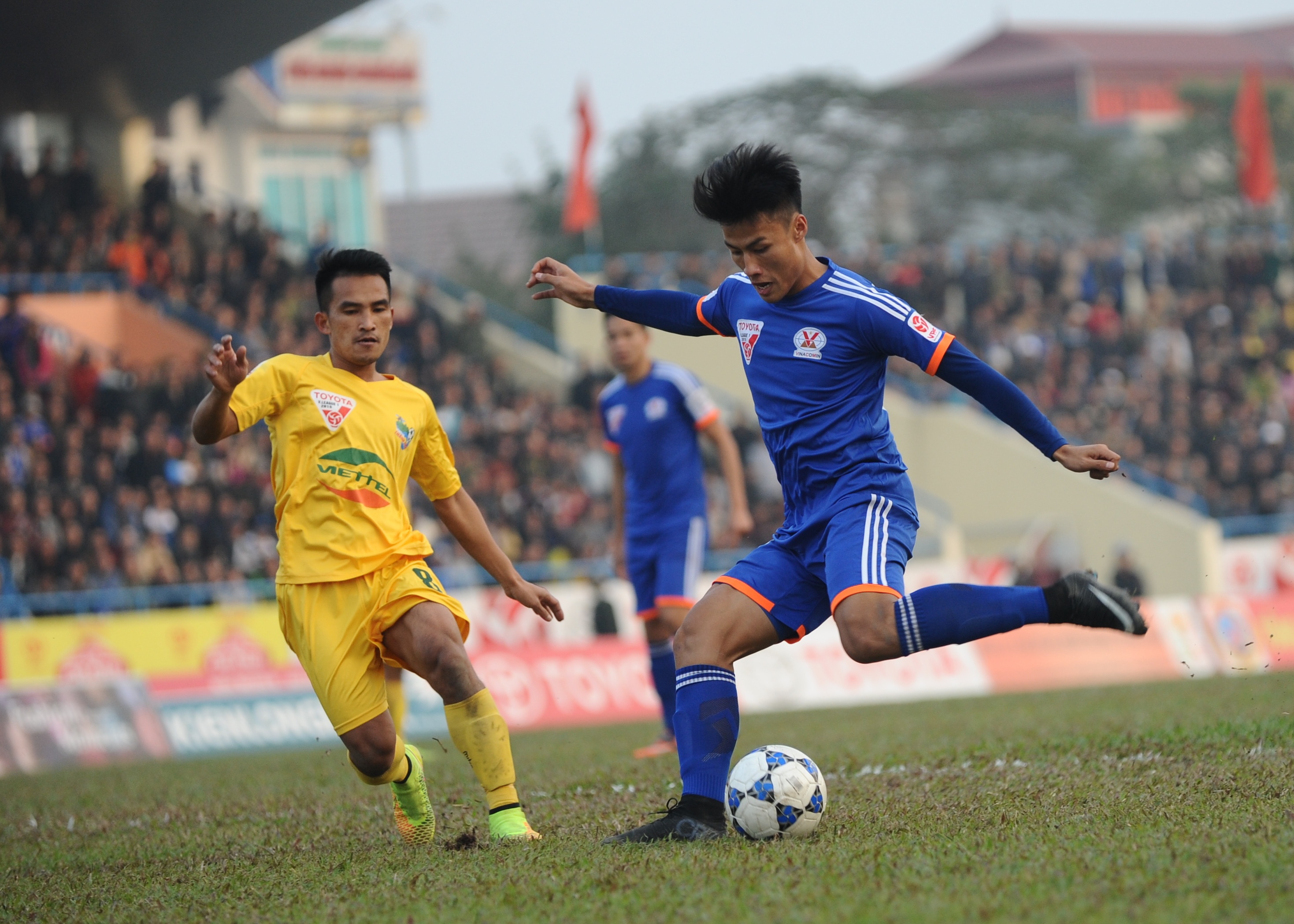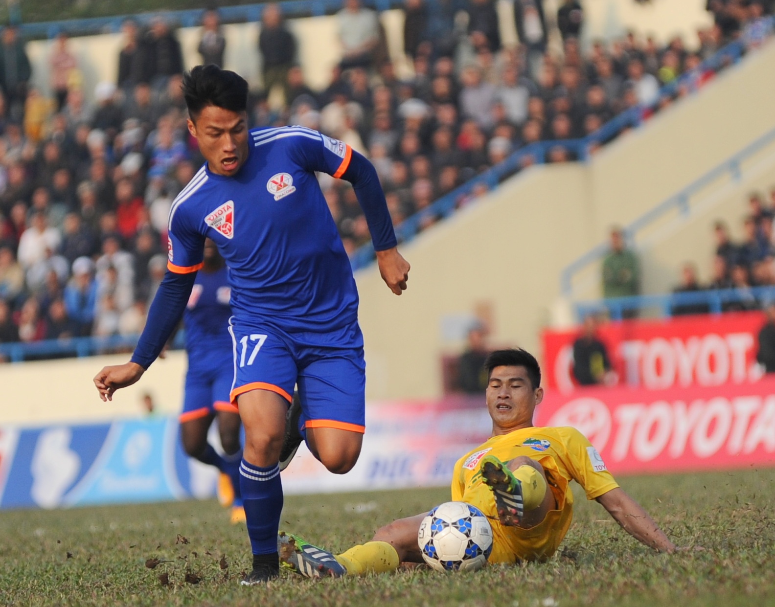 | Những phút cuối trận Vũ Minh Tuấn và đồng đội nỗ lực gia tăng sức ép lên phần sân của Thanh Hoá. |