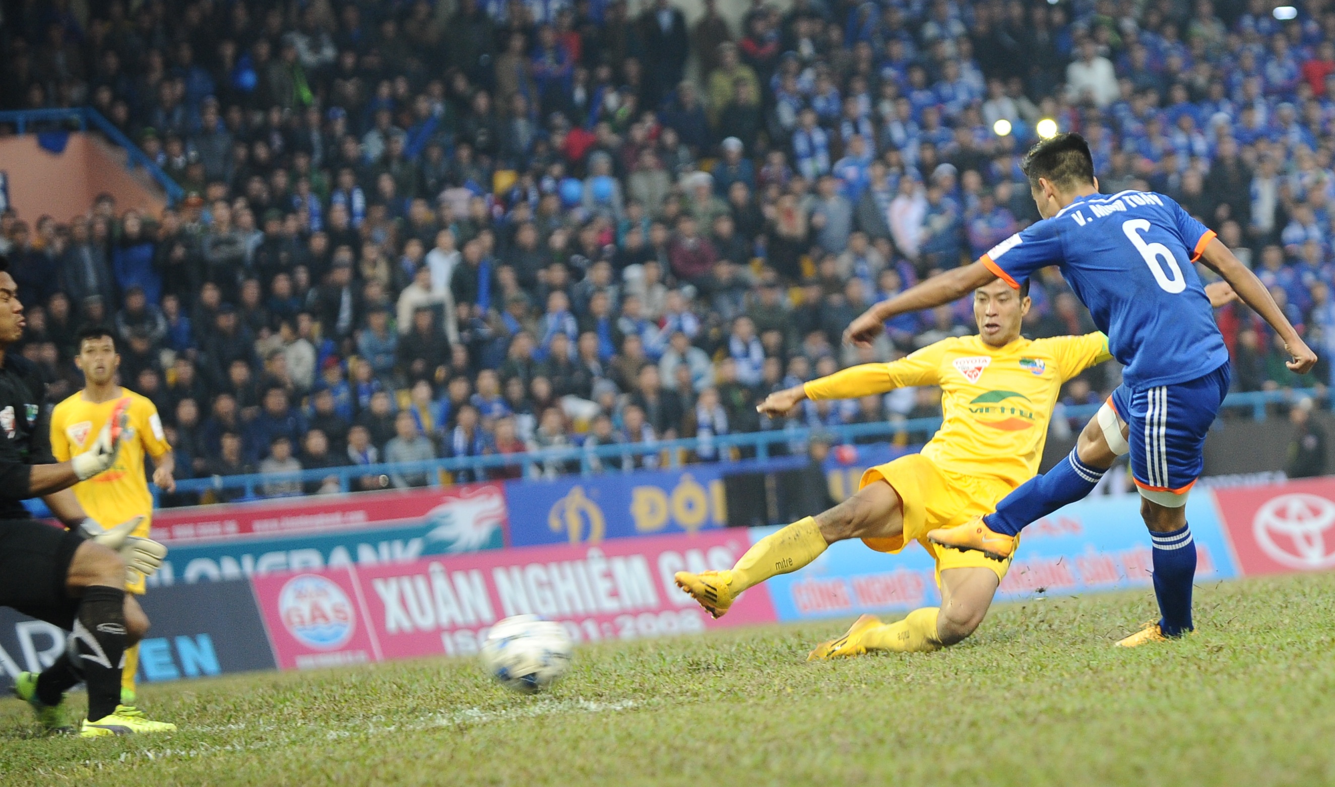 | Mỗi khi có khoảng trống, Mạc Hồng Quân thử sức với những cú sút bằng chân trái để gây bất ngờ. Tuy nhiên bóng thường đi đúng vị trí của thủ môn Tô Vĩnh Lợi. |