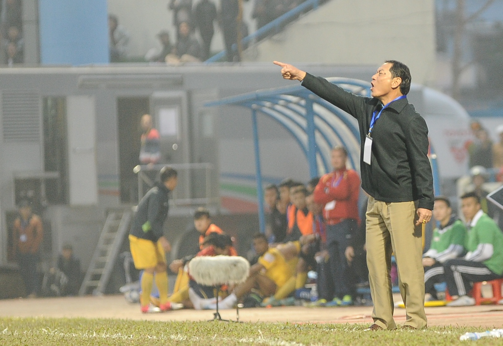 | HLV Đinh Cao Nghĩa đứng sát đường pitch chỉ đạo các học trò nhằm tránh trận thua trên sân nhà. |