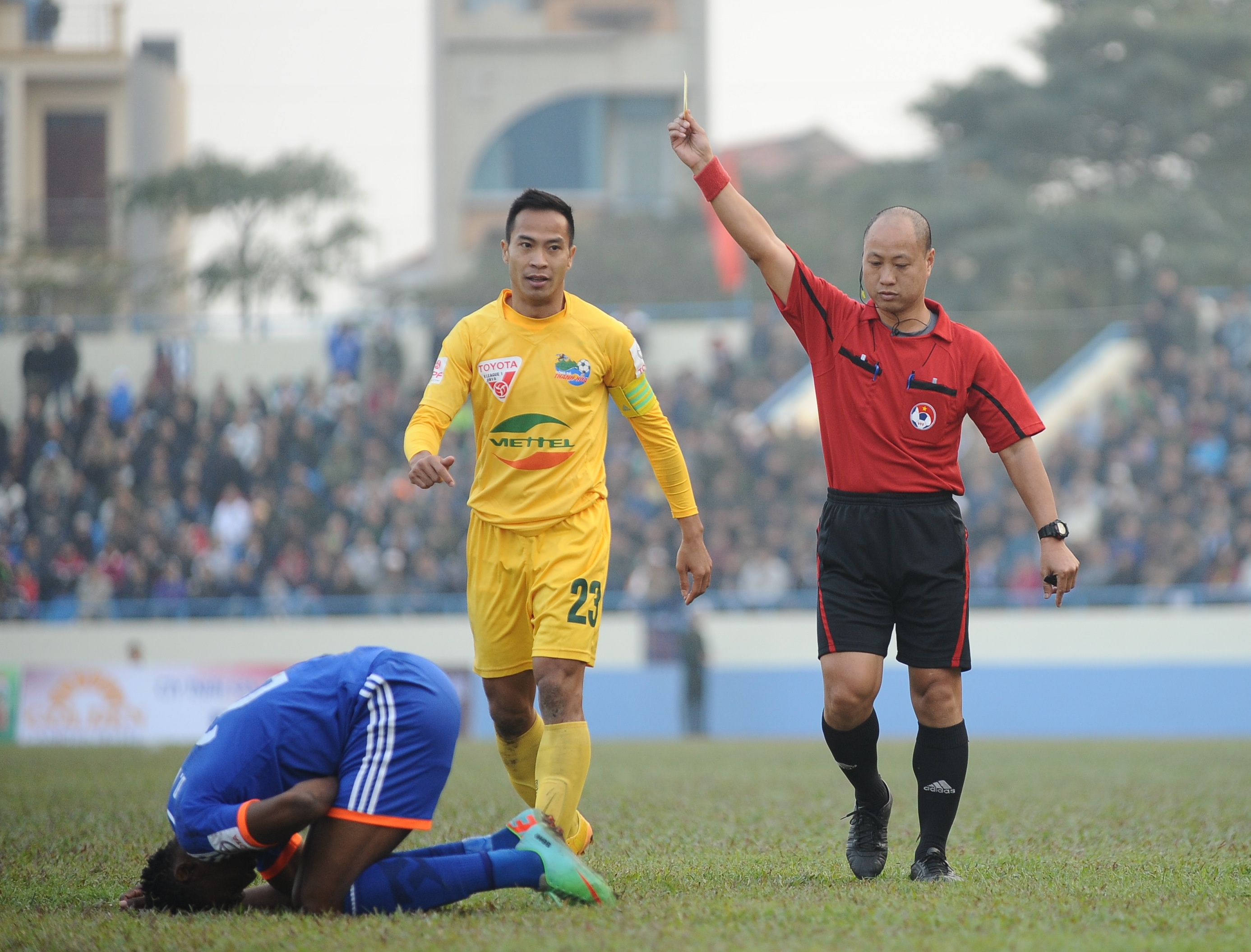 | Tình huống Đinh Hoàng Max bị đội trưởng Lê Đức Tuấn của Thanh Hoá phạm lỗi khiến anh phải rời sân nhường chỗ cho Nguyễn Xuân Ngọc. |