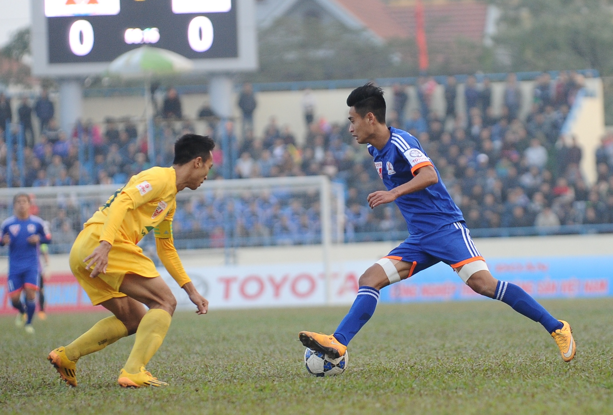 | Mạc Hồng Quân bị theo kèm khá chặt ngay khi được vào sân. Chính vì vậy anh thường xuyên phải tung đường chuyền vội tới chân tiền đạo ngoại binh Mariano. |