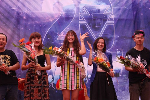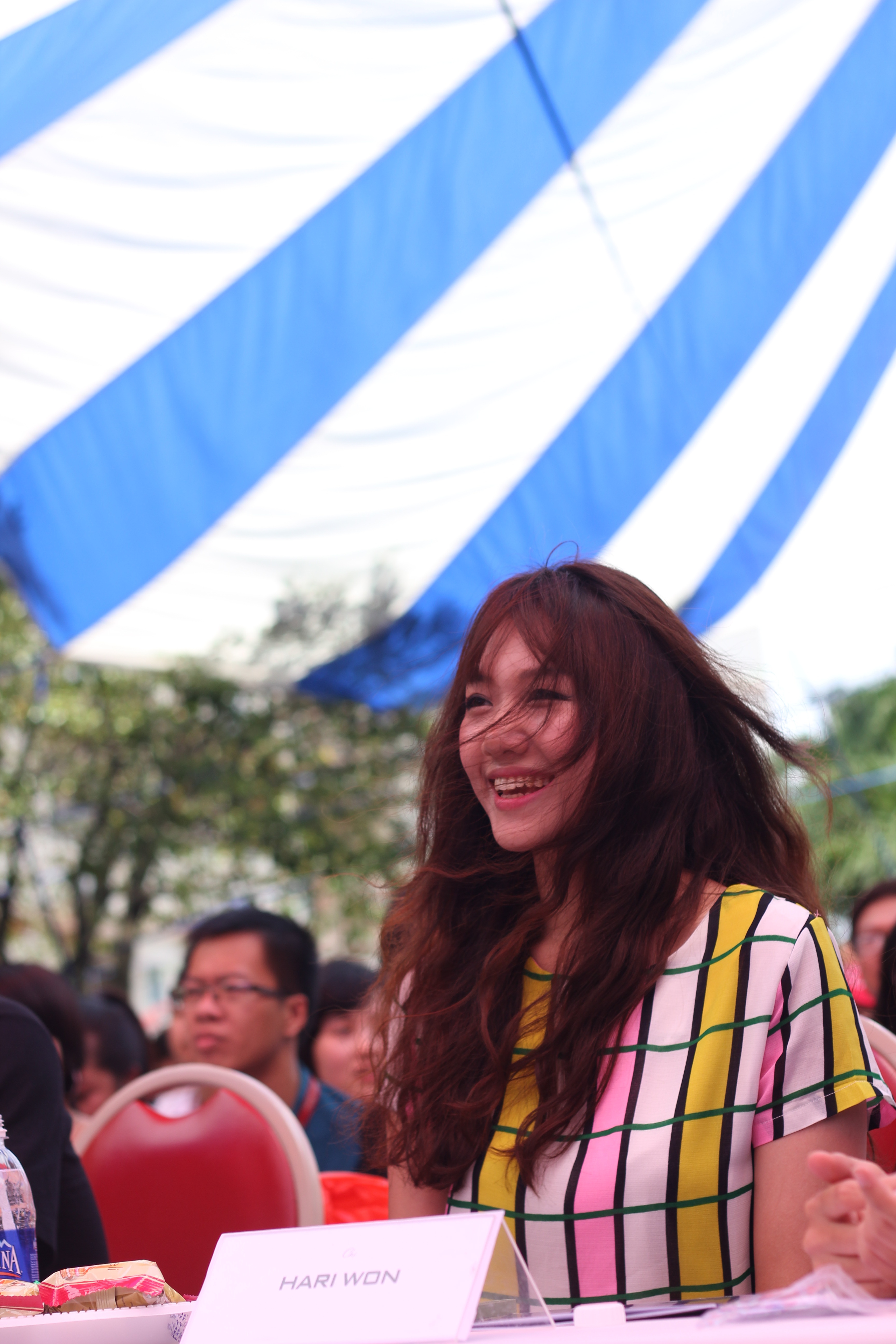 Hari Won tới dự Ngày hội Ngoại Thương - FTU's Day 2013 với tư cách là thành viên ban giám khảo của cuộc thi nhảy Futuristic. Bạn gái Tiến Đạt cười tươi rói và vẫy tay chào các bạn sinh viên khi cùng các "đồng nghiệp" khác nhận bó hoa kỷ niệm.