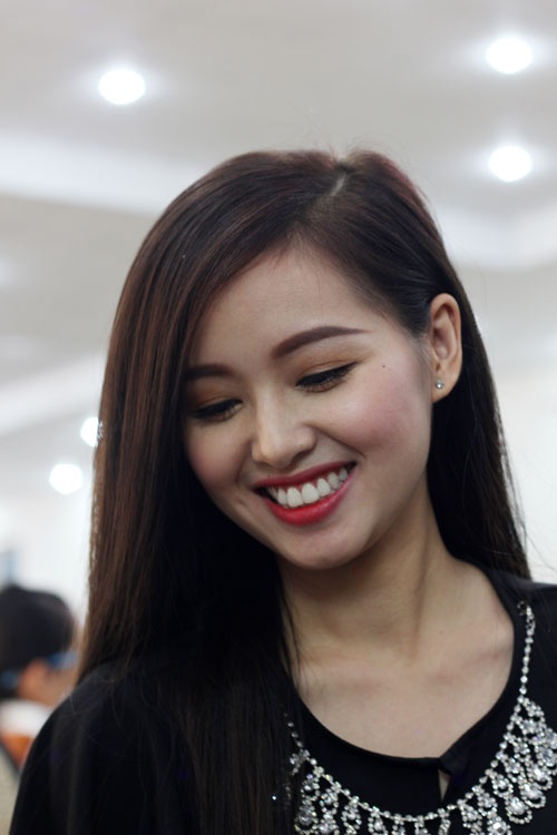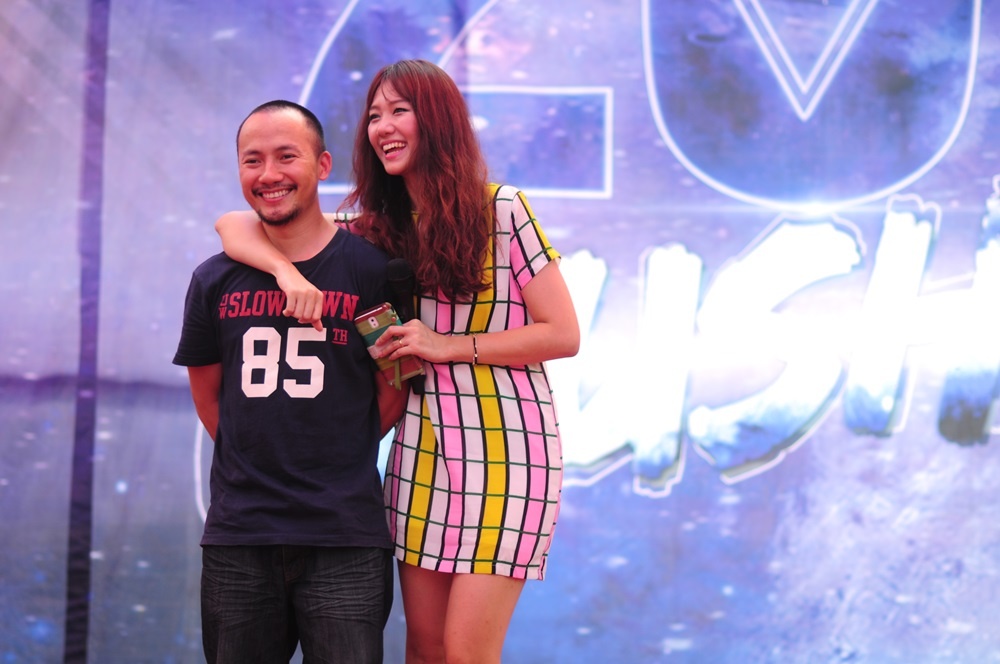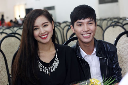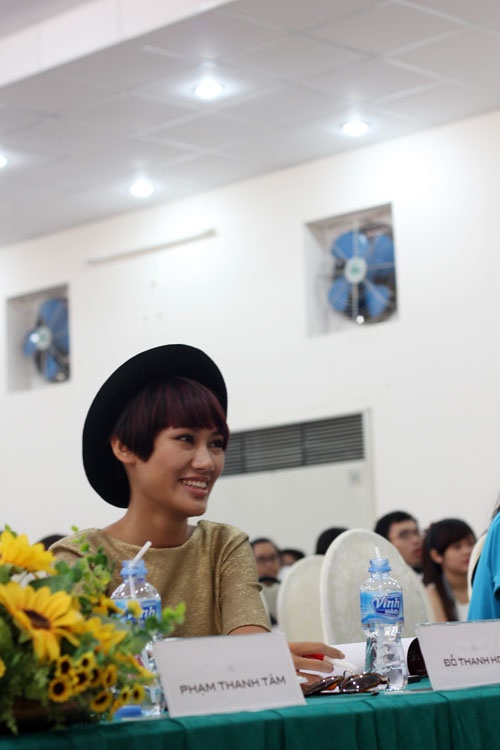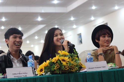 ...hay đứng trên sân khấu để giao lưu với các bạn sinh viên, Hari đều gây ấn tượng mạnh bởi sự thân thiện và tươi vui. Nụ cười luôn thường trực trên môi cô bạn gái Tiến Đạt.