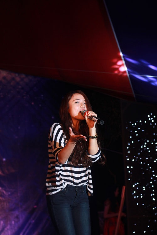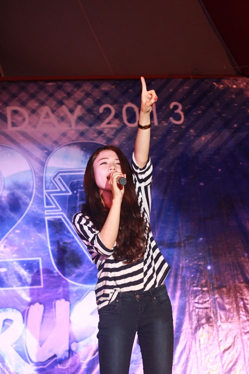 | Cô bạn gái hot girl của Tiến Đạt vui vẻ hát tặng các bạn sinh viên trường Đại học Ngoại Thương ca khúc Aloha. |
