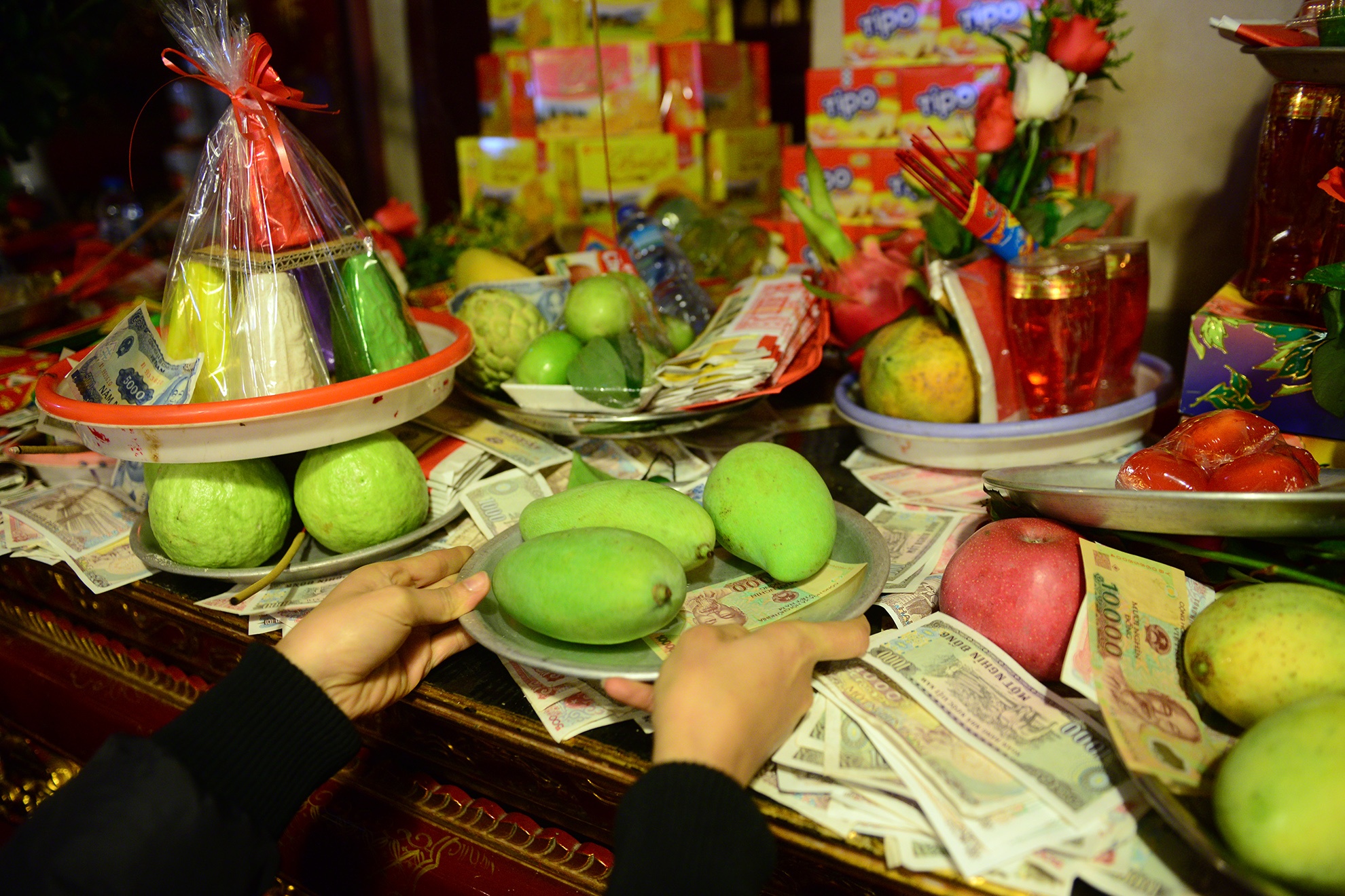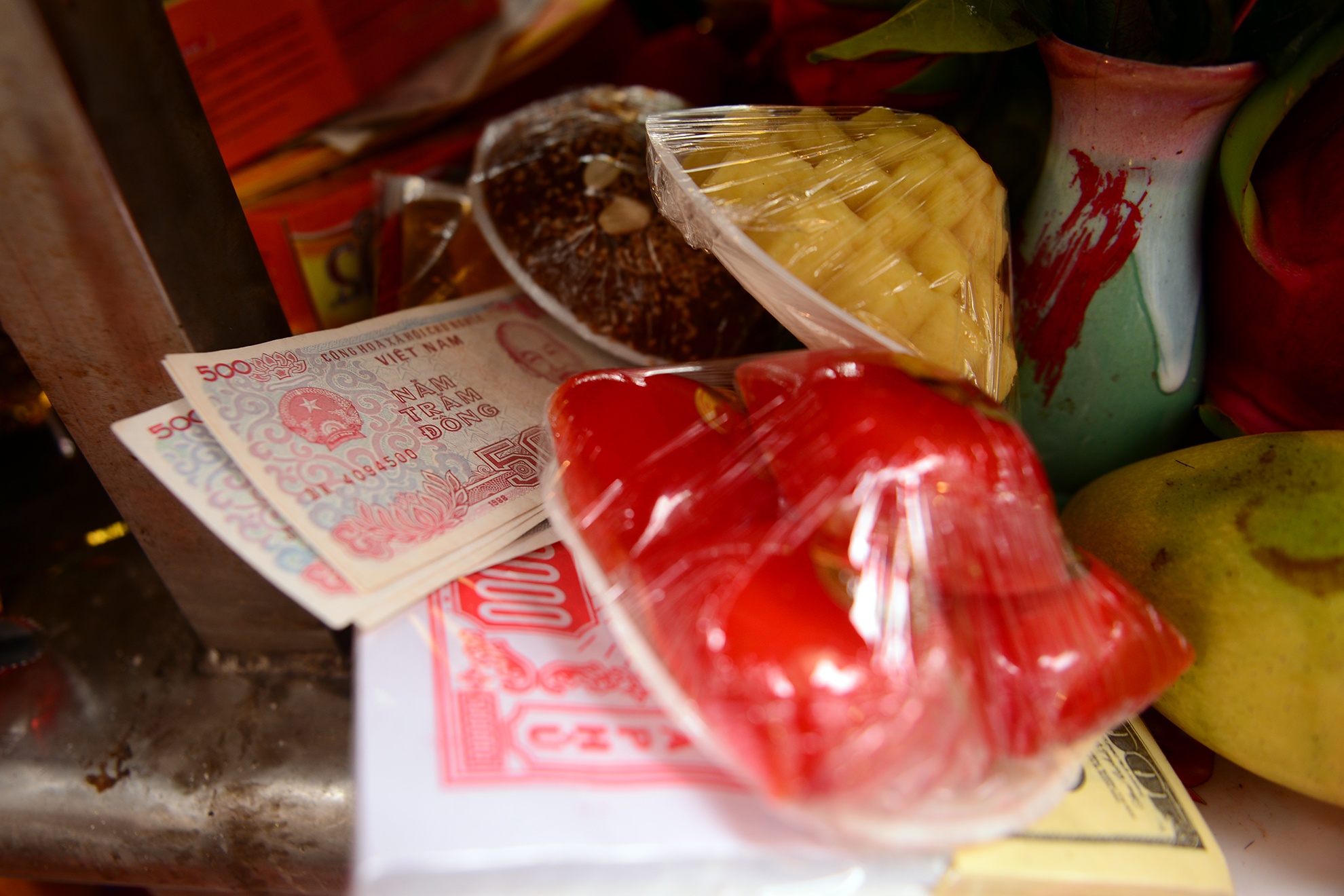 | Những tờ tiền có mệnh giá nhỏ được cài cắm cùng đồ lễ trong mâm cúng. |