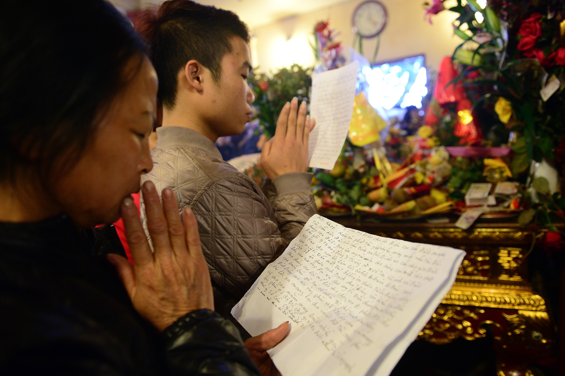 | Nhiều người chép sẵn lời cúng ra giấy rồi vào trong điện thờ làm lễ. |