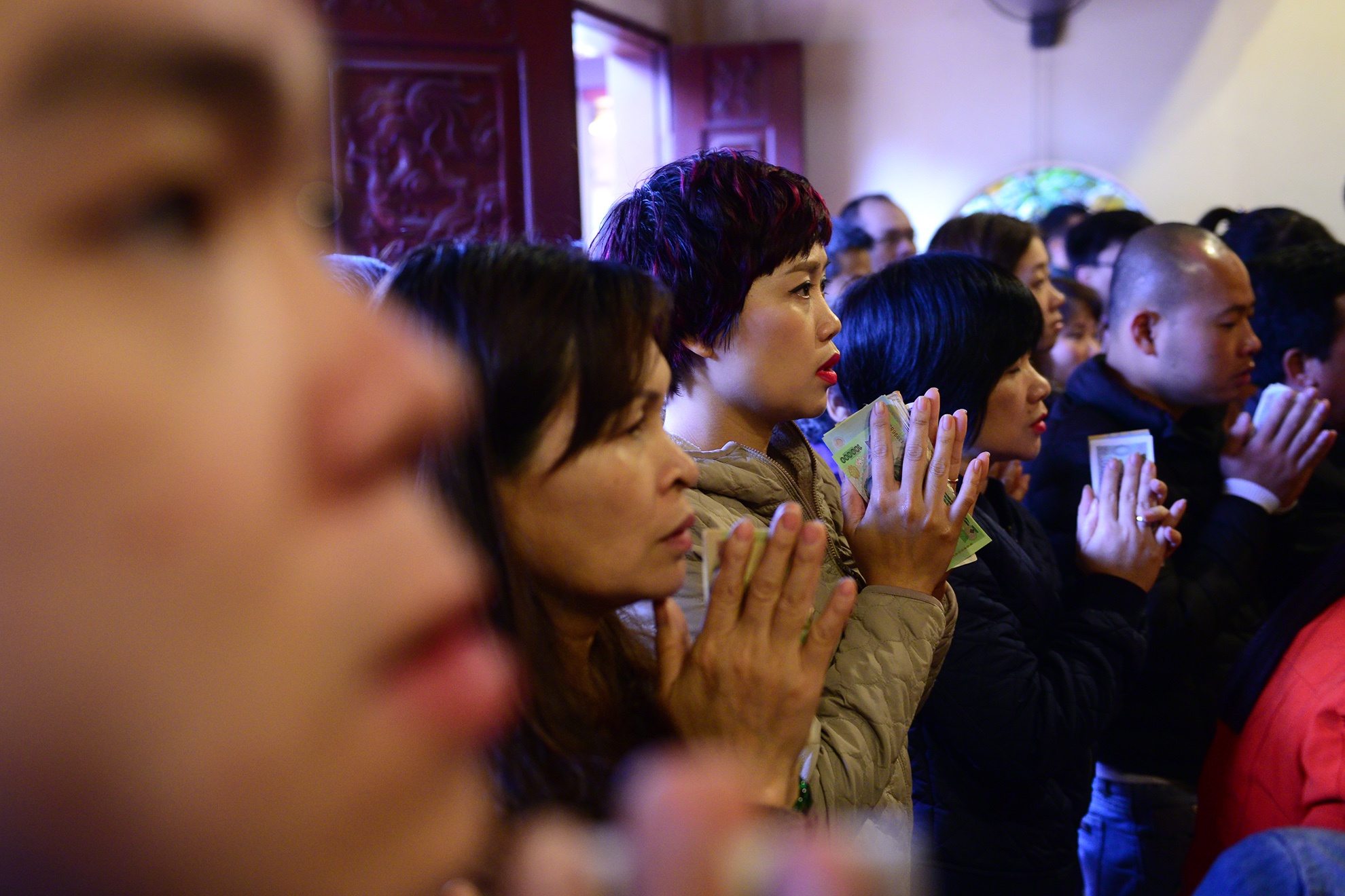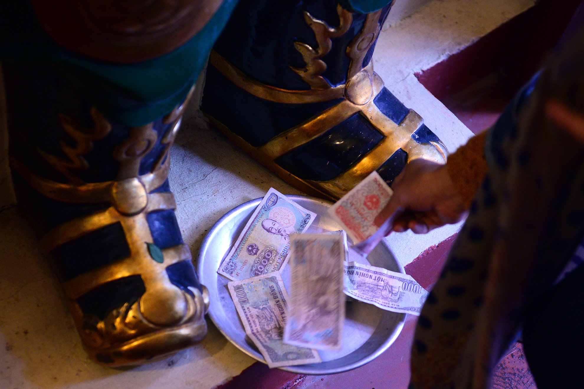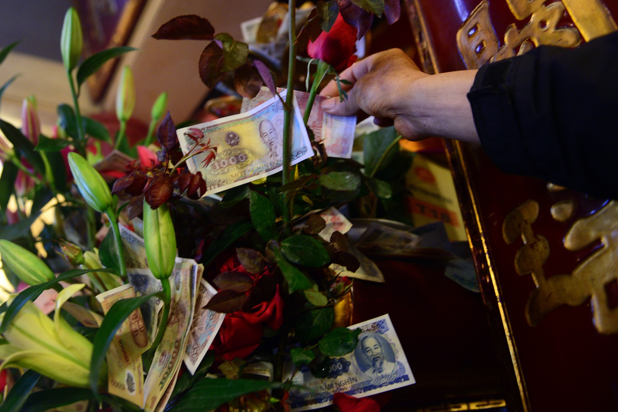 | Nhiều người cầm cả xấp tiền nhiều mệnh giá khác nhau, chủ yếu là tiền lẻ để đặt lễ. |