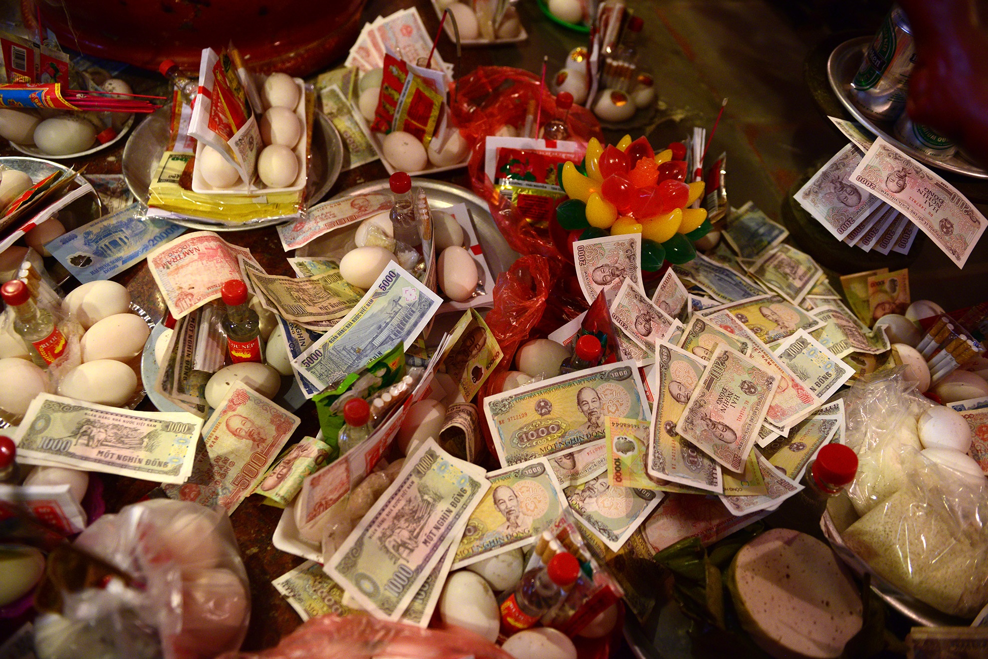 | Ngoài lễ vật, các mâm cúng còn được kèm thêm nhiều tiền lẻ. Ảnh chụp tại Điện Công Đồng. |