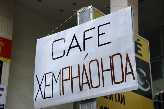 | Một quán cà phê treo bảng phục vụ khách xem pháo hoa. |