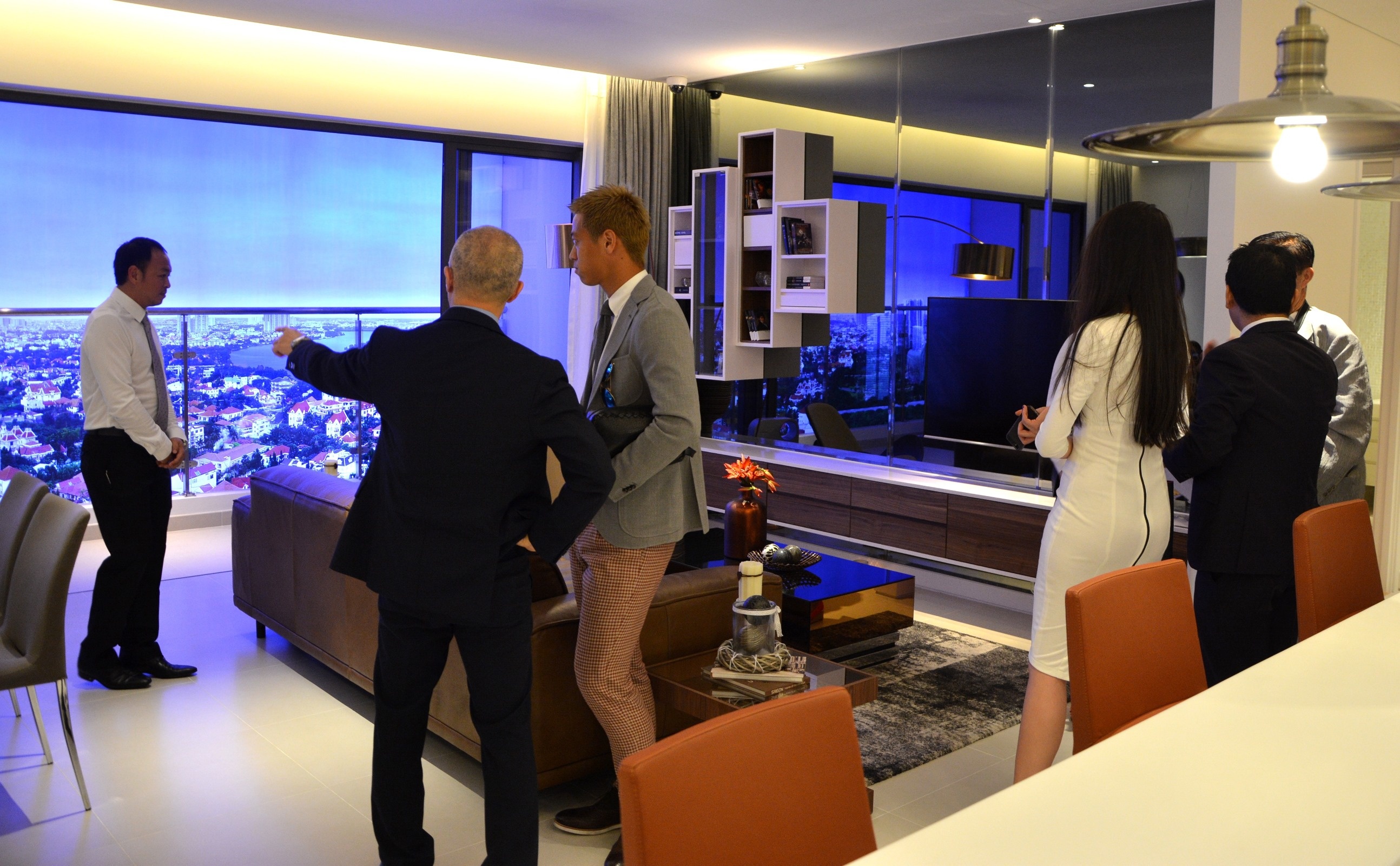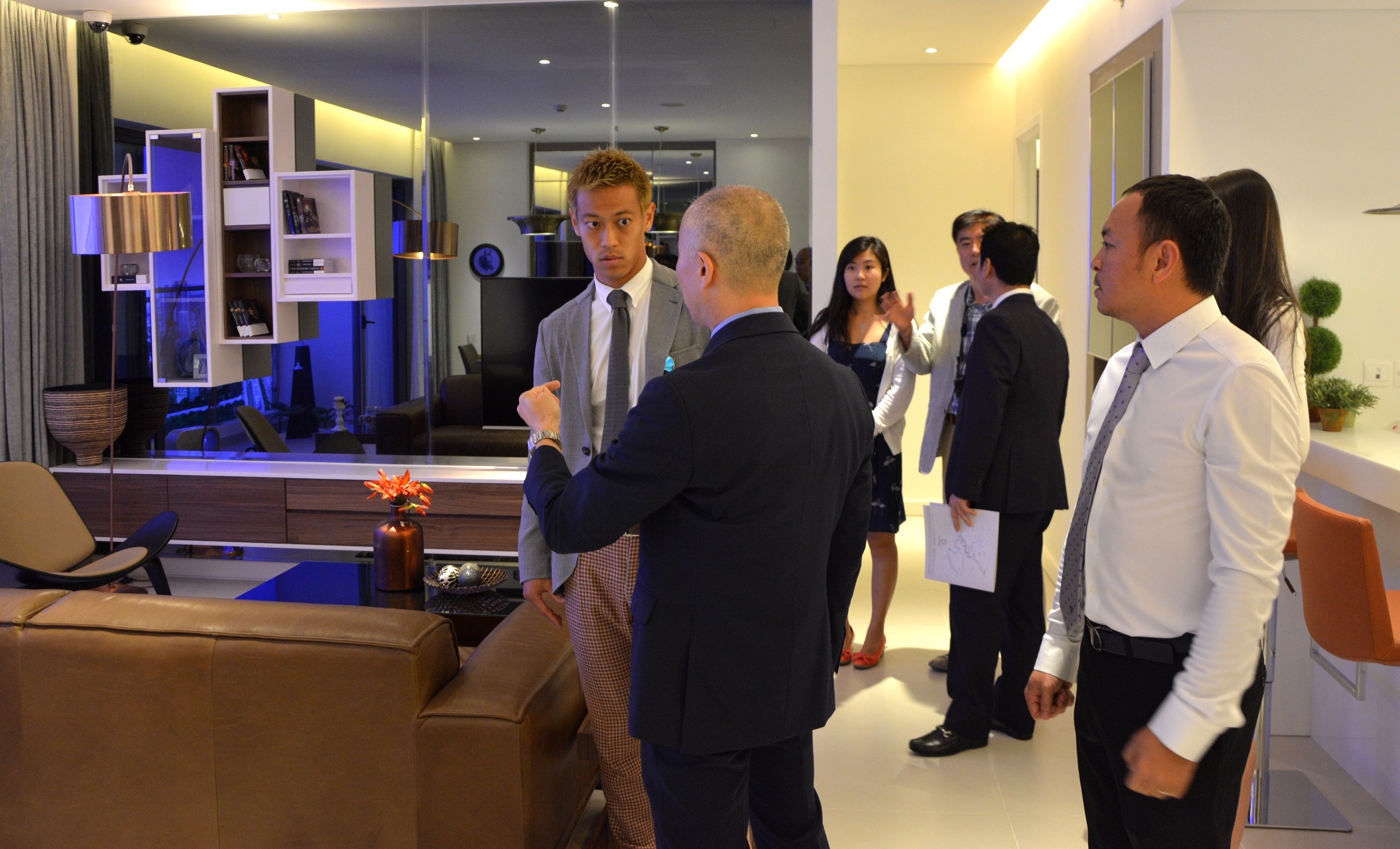 Keisuke Honda đang tham quan căn hộ 4 phòng ngủ của dự án Gateway Thảo Điền. Anh cho biết mình đang chờ chính sách sở hữu bất động sản của người nước ngoài bắt đầu có hiệu lực từ 1/7 để có cơ hội đầu tư vào bất động sản tại Việt Nam.