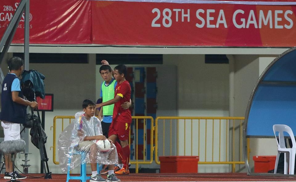 | Hữu Dũng phải nhờ nhân viên y tế dìu rời sân sau khi va chạm với cầu thủ U23 Lào. |