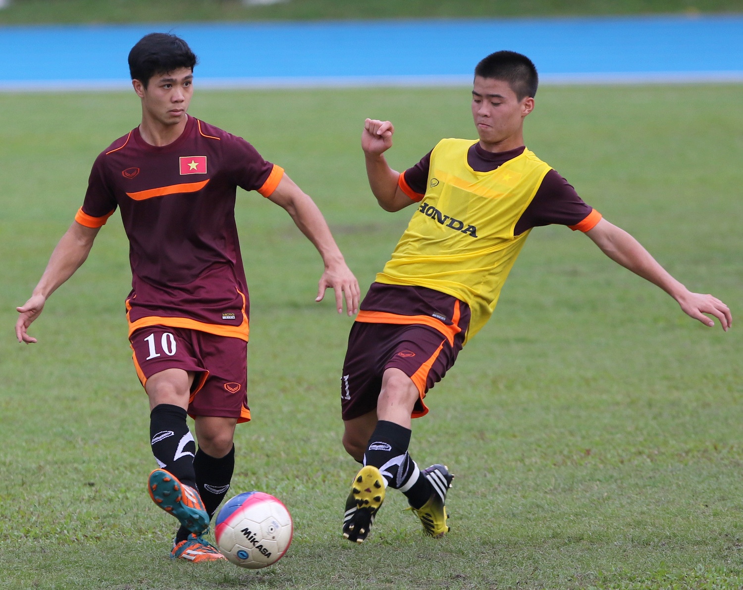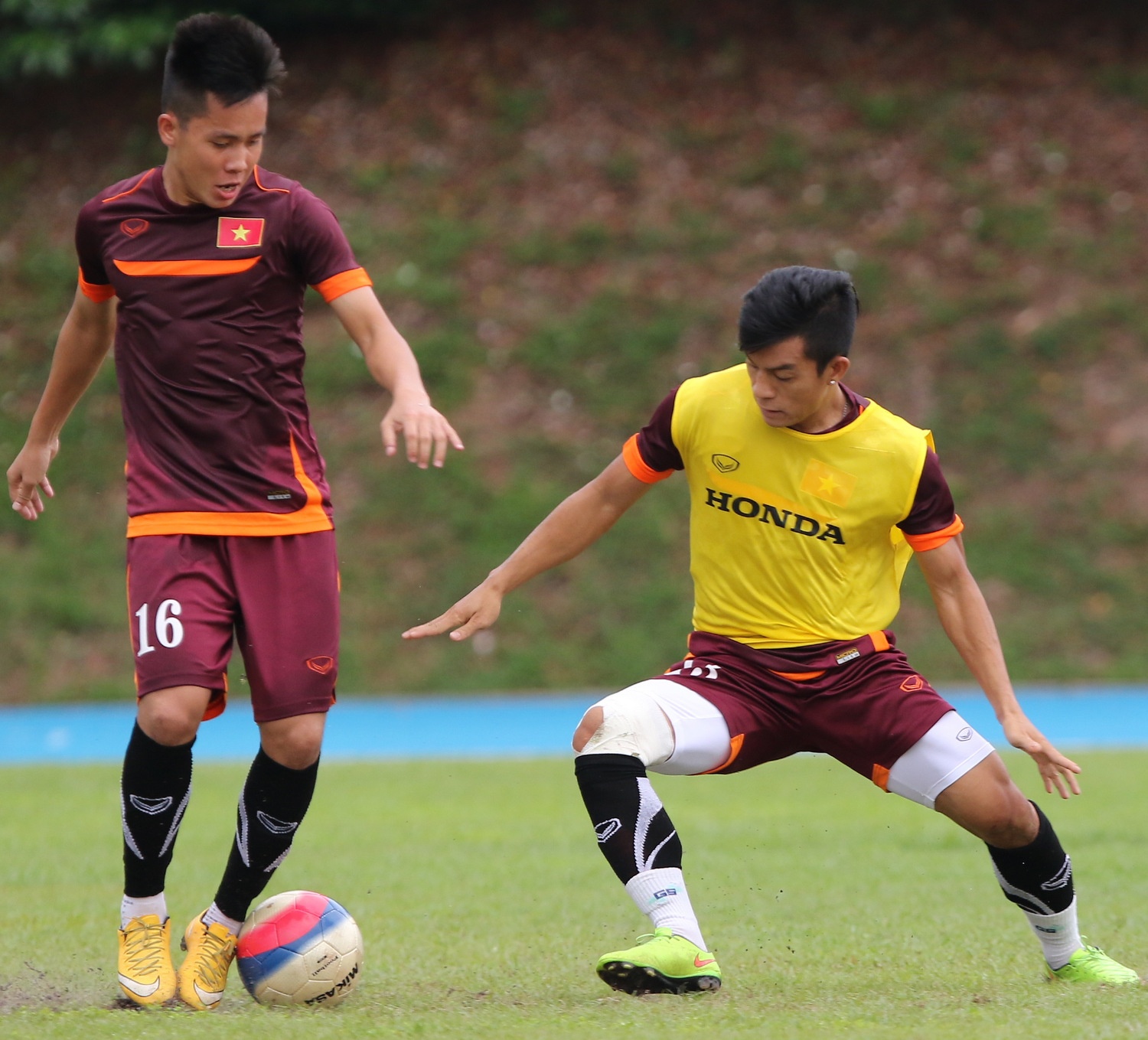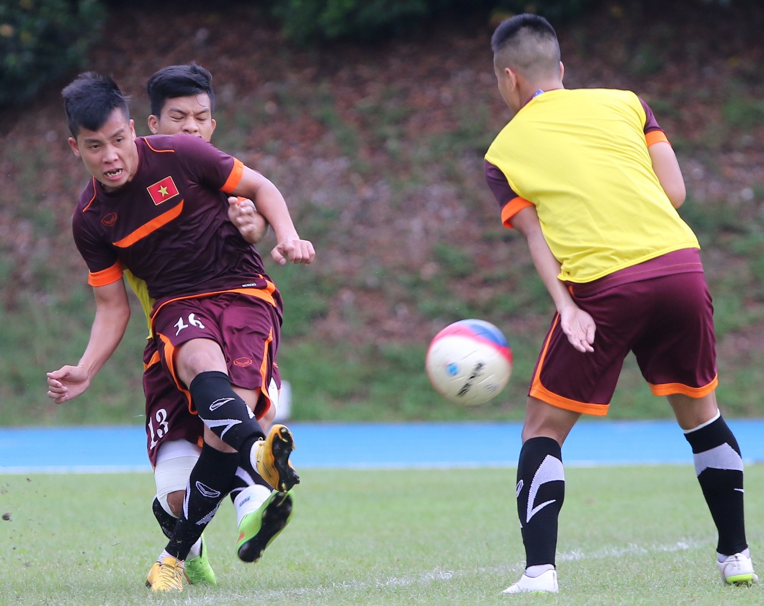 | Dù đá đối kháng trong phạm vi nhỏ, HLV Miura yêu cầu đội áo nâu đỏ gồm các tiền đạo phải tích cực phá bẫy việt vị của đội áo vàng. Thanh Bình (trái) trong một tình huống chạm trán với hậu vệ phải Tấn Tài. |