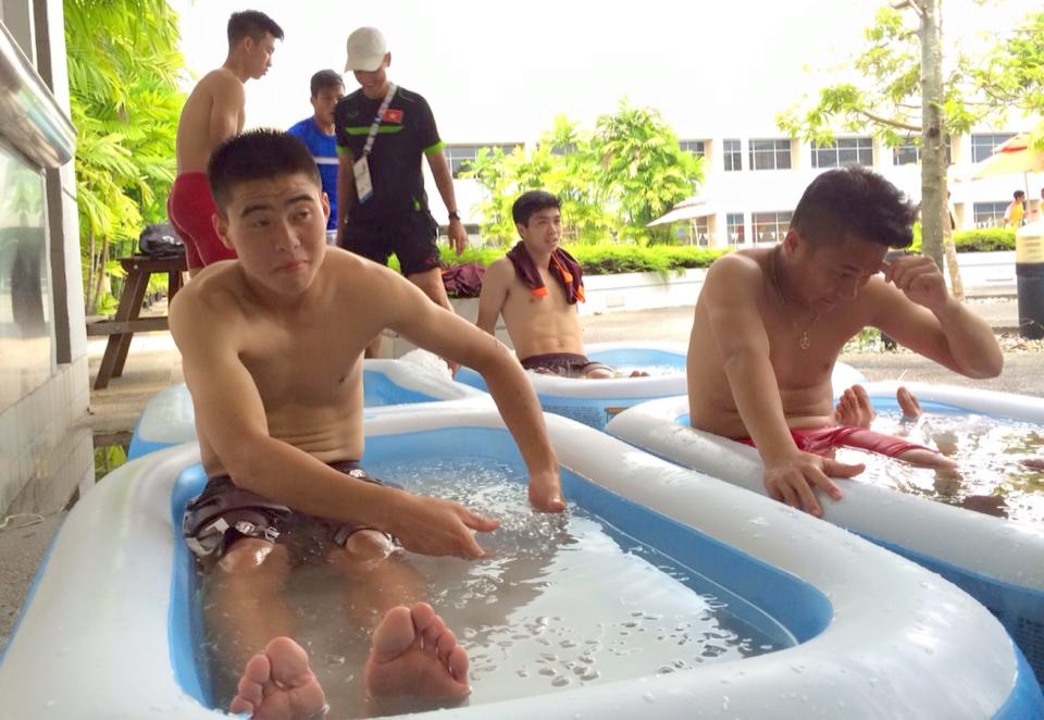 | Toàn đội ngâm nước đá để hồi phục trước khi lên xe về khách sạn Days. Chiều nay (27/5), U23 Việt Nam có buổi tập lúc 15h (giờ Singapore) trên sân Nanyang. Tới ngày 28/5, BTC SEA Games sẽ bố trí cho thầy trò HLV Miura tập làm quen sân thi đấu Bishan để chuẩn bị cho trận khai mạc gặp Brunei vào 29/5. |