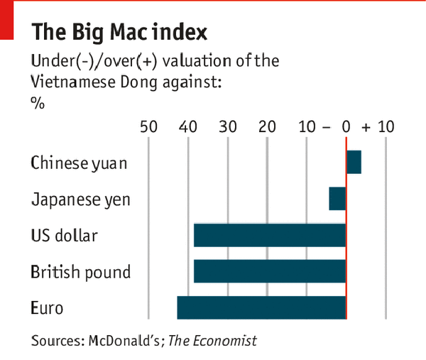 Do giá của Big Mac là 60.000 VNĐ, tương ứng với 2,84 USD ở thị trường Việt Nam, so với 4,62 USD ở thị trường Mỹ, chúng tôi cho rằng, đồng tiền của Việt Nam bị định giá thấp hơn 39% so với đồng USD. Loại tiền tệ này, mà vốn có sự liên kết lỏng lẻo với đồng đô la, đã trở nên ổn định kể từ tháng 6, khi Ngân hàng Trung ương của Việt Nam chủ động khiến nó mất giá 1% so với đồng USD để cải thiện cán cân thanh toán. Việc giữ tỷ giá hối đoái thấp sẽ đẩy mạnh xuất khẩu. Cán cân thương mại của Việt Nam đã đạt thặng dư trong năm 2012, khi tiền tệ được hỗ trợ tốt hơn từ nền kinh tế. Lạm phát đã giảm từ 30% năm 2008 xuống còn khoảng 5-6%.