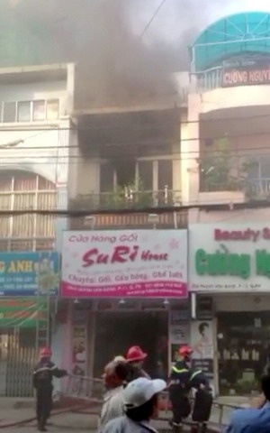 | Khói phun dày đặc từ tầng 1 cửa hàng Suri. |