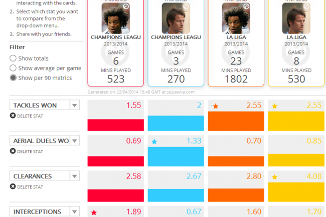 | Thống kê chi tiết về những chỉ số tắc bóng, cản bóng, phá bóng, tranh chấp của Marcelo và Coentrao tại La Liga và Champions League. |