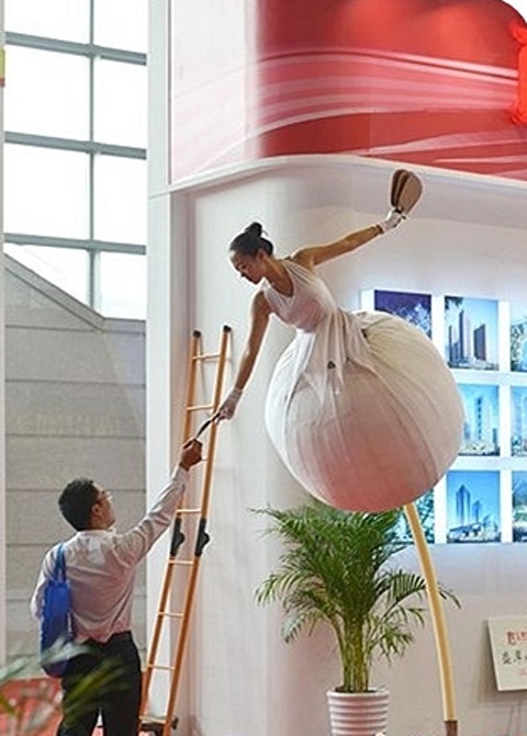 | Một cô gái khác đứng trong một quả bóng trên cao tặng khách hàng những chiếc quạt gấp tại một hội chợ nhà ở được tổ chức tại Vô Tích, tỉnh Giang Tô ngày 11/10. |