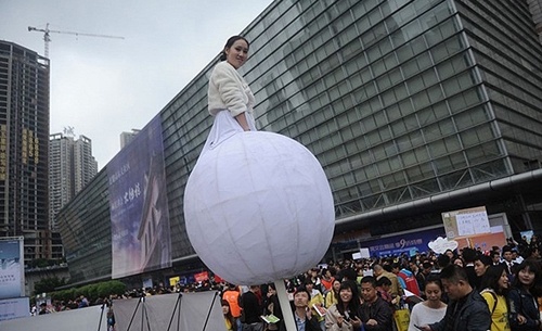 | Một cô gái đứng trong một quả bóng trên cao để quảng cáo cho công ty bất động sản, thu hút sự chú ý của rất nhiều người xem tại hội chợ nhà ở được tổ chức tại Trùng Khánh vào ngày 17/10. |