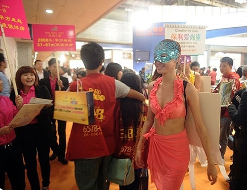 | Những cô gái 'chân dài' trong bộ đồ ngắn cầm những tấm áp phích quảng cáo cho một công ty bất động sản tại hội chợ nhà ở được tổ chức tại Trùng Khánh, Trung Quốc vào ngày 17/10 |