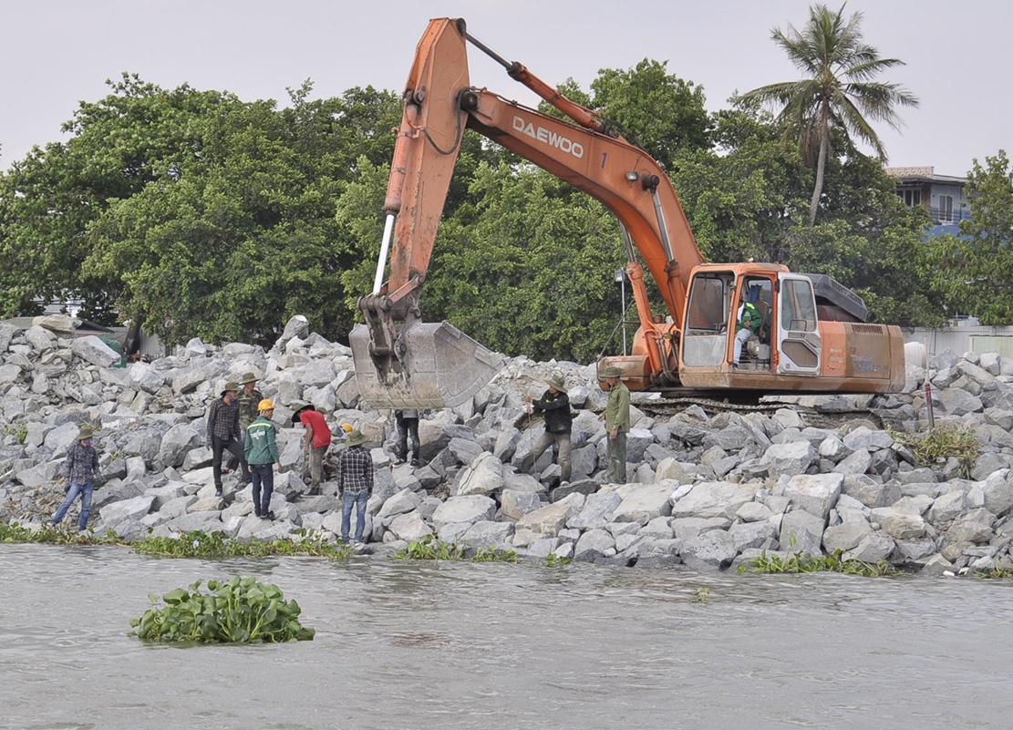 | Chiều 24/3, nhiều công nhân và máy móc vẫn đổ đất, đá lấp sông Đồng Nai. Ảnh: Ngọc An. |