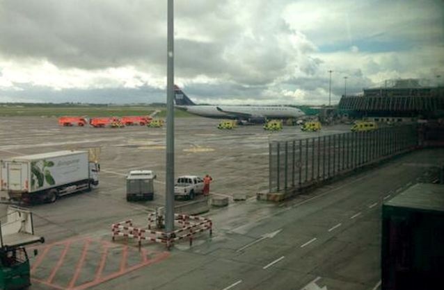 | Các xe cứu thương và cứu hỏa đợi sẵn ở phi trường quốc tế Dublin trước khi máy bay của hãng US Airways đáp xuống đây hôm 10/5. Ảnh: Daily Mail |