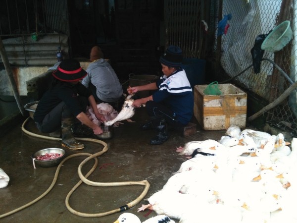 | Vịt sống, vịt đã vặt lông nằm lăn lóc, lẫn lộn giữa sân. |